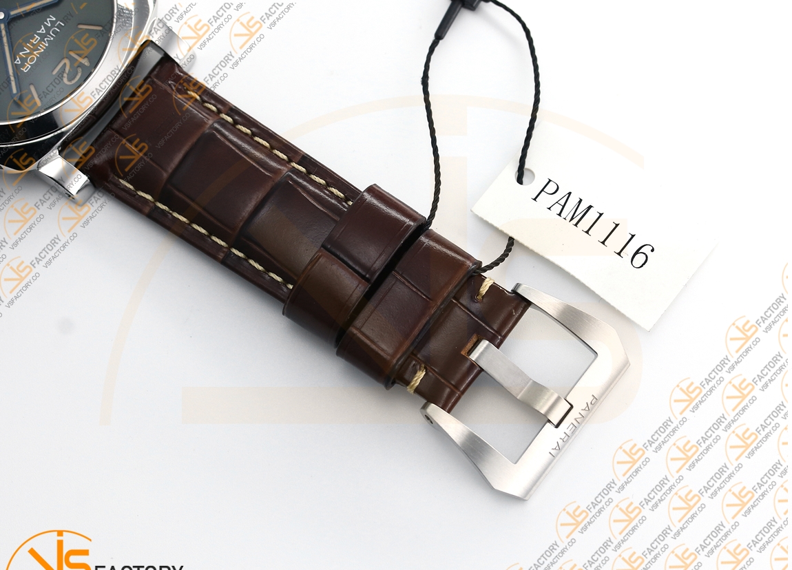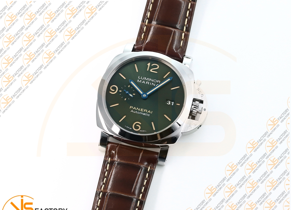 The VS Factory Panerai Luminor Marina PAM1116 features a striking green dial housed in a robust stainless steel case, paired with a brown leather strap for timeless appeal. Driven by the high-precision P.9010 clone movement, it offers excellent reliability and durability. With luminous hands, small seconds at 9 o’clock, and 300m water resistance, this 44mm timepiece blends rugged functionality with classic Panerai design.