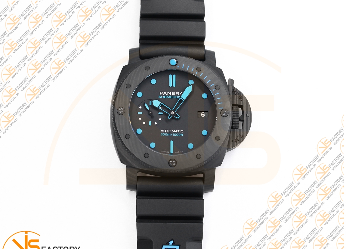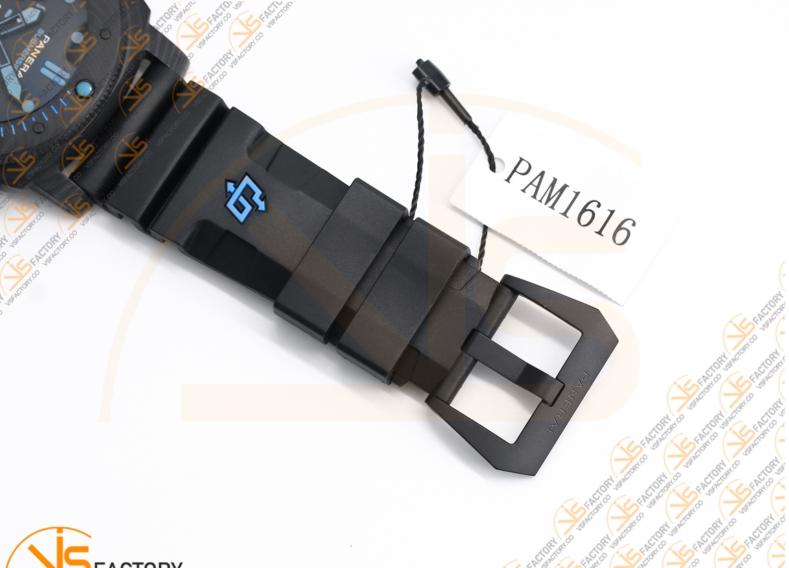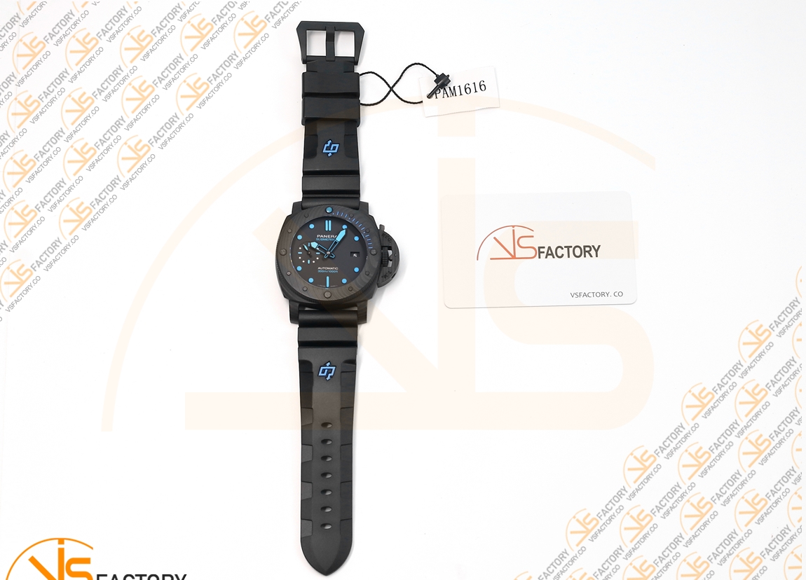 The VS Factory Panerai PAM1616 Submersible stands out with its 47mm CarboTech carbon case, bold black dial, and striking blue markers for optimal legibility. Designed for deep-sea adventures, it features a robust P9010 clone movement with 3-day power reserve and 300m water resistance. The black rubber strap ensures comfort and durability, making this watch an ideal companion for professional divers and Panerai collectors alike.
