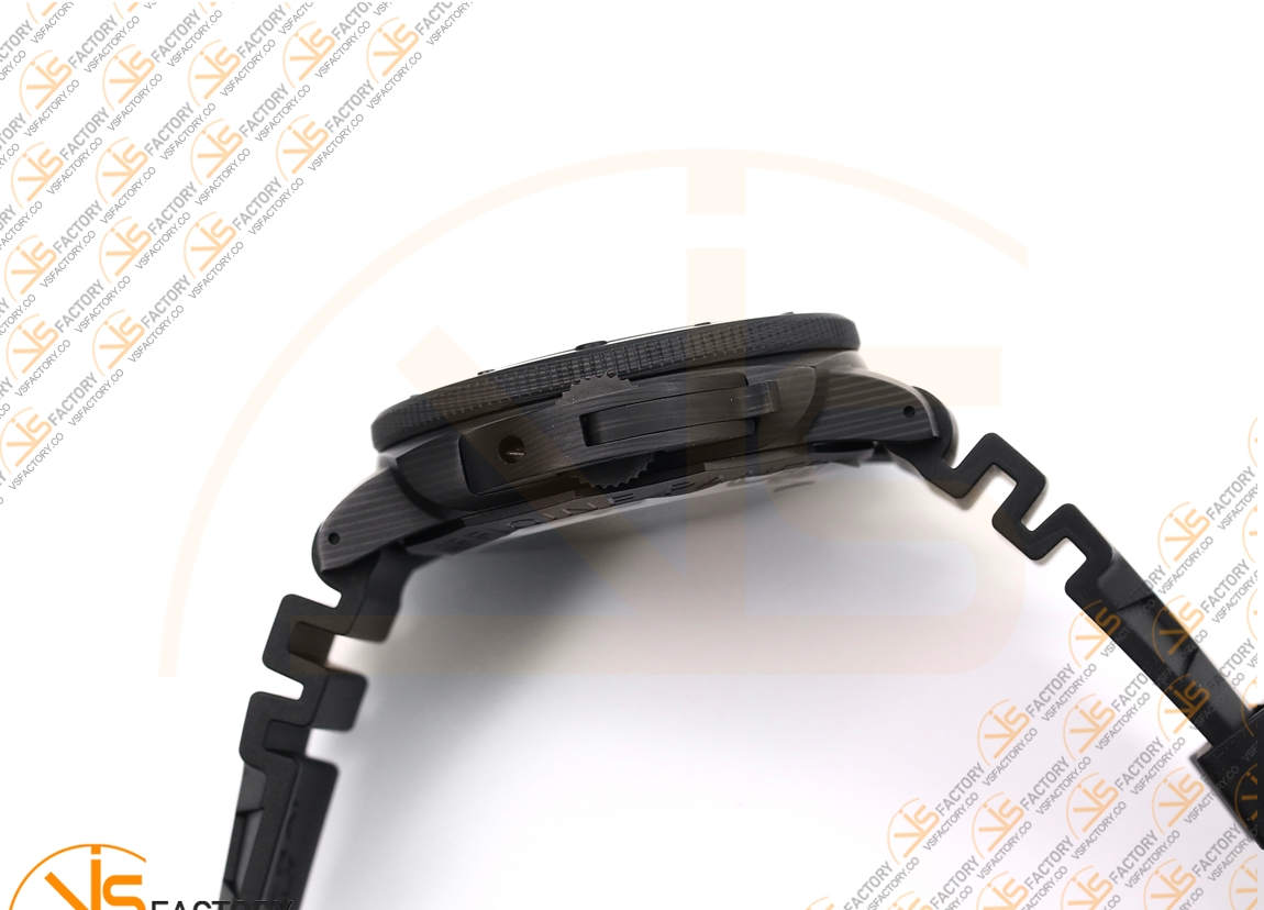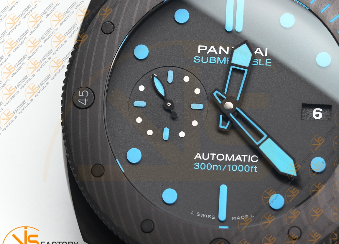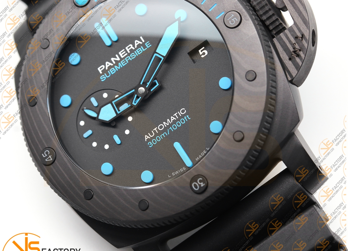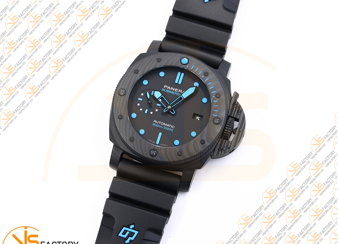 The VS Factory Panerai PAM1616 Submersible stands out with its 47mm CarboTech carbon case, bold black dial, and striking blue markers for optimal legibility. Designed for deep-sea adventures, it features a robust P9010 clone movement with 3-day power reserve and 300m water resistance. The black rubber strap ensures comfort and durability, making this watch an ideal companion for professional divers and Panerai collectors alike.