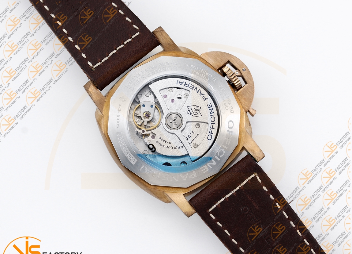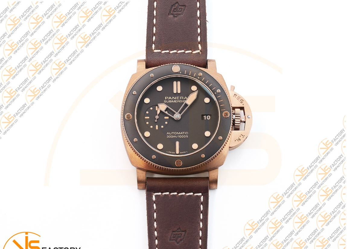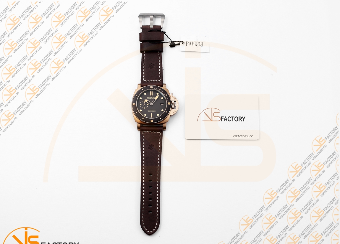 The VSFactory Panerai Submersible Bronzo PAM968 showcases a unique bronze case with a rich brown ceramic bezel and matching brown dial, exuding rugged elegance. Fitted with a durable brown calfskin leather strap, it blends maritime heritage with luxury design. Powered by the P.9010 Super Clone movement, this timepiece offers superior accuracy and bold wrist presence for Panerai collectors.