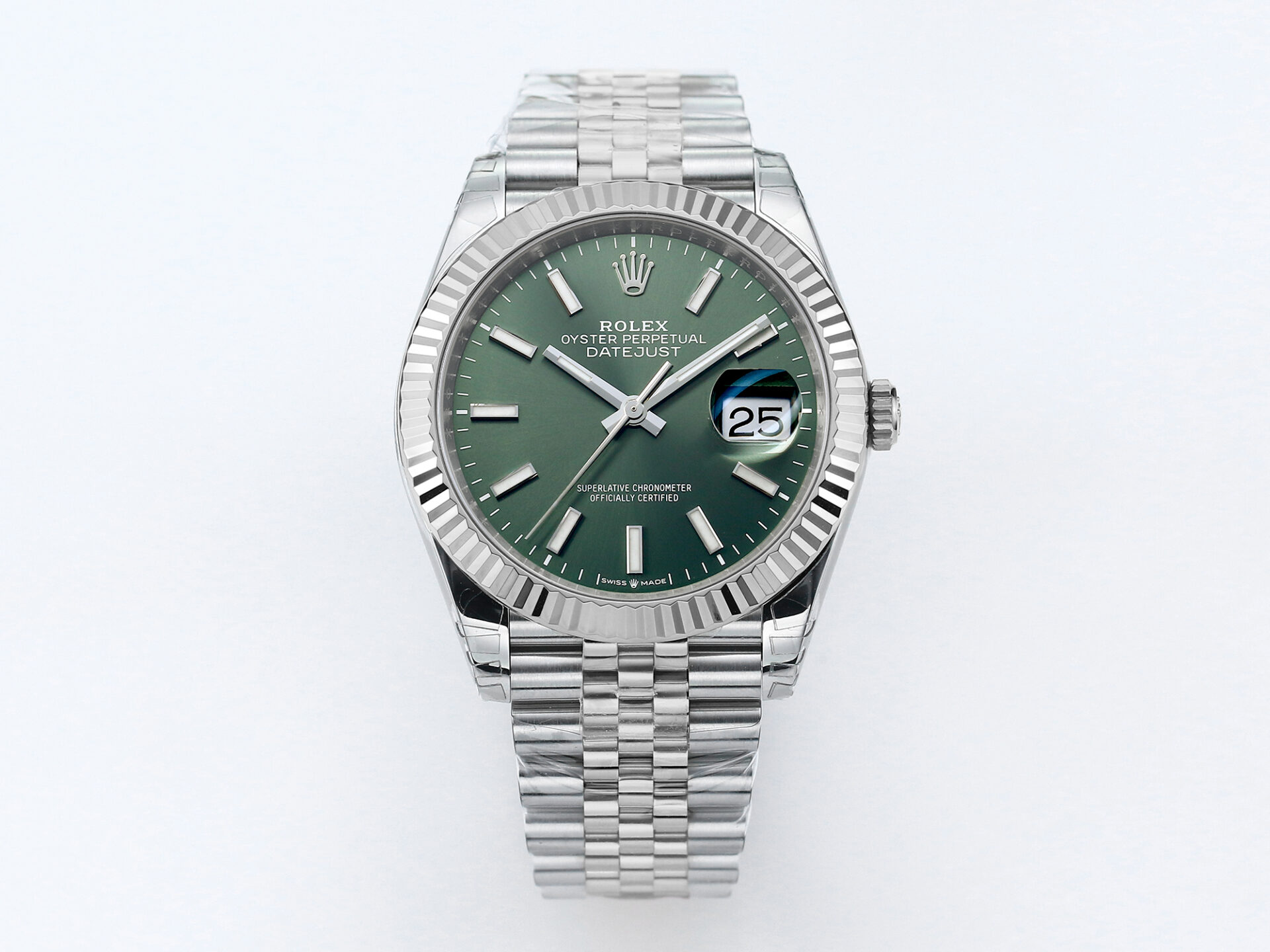 The Rolex DateJust 41 126334 by VSFactory features a stunning green dial housed in a 904L stainless steel case. Enhanced with a Jubilee bracelet and powered by the reliable VS3235 movement, this timepiece blends iconic design with modern craftsmanship. Perfect for those who appreciate refined elegance with a bold dial color.