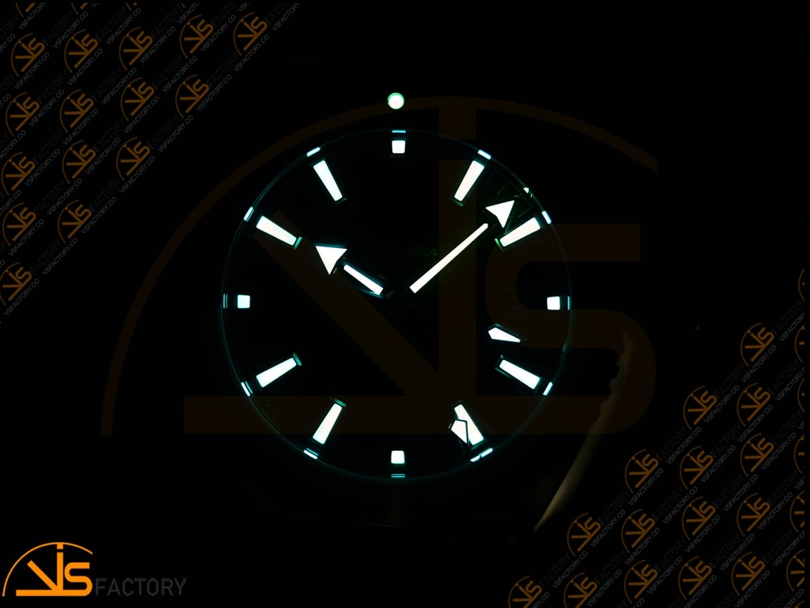 Dial | Black superlumed dial and hands (lumed with genuine Super-LumiNova, Blue on hour markers and hour hand, Green on pearl and minute hand, same as genuine) |