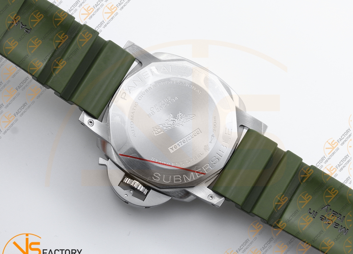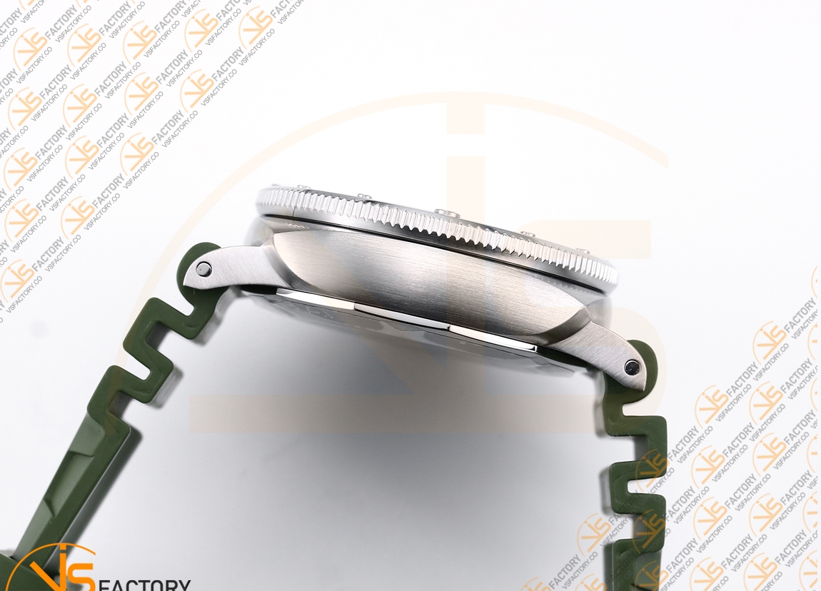 象徴的なクッション型ケースとクラウンガードデザインがパネライの伝統を受け継ぎつつ、モダンな素材と技術が融合した一本。VS工場の高い製造品質が際立つ、コレクターにも愛されるラグジュアリーダイバーズウォッチです。